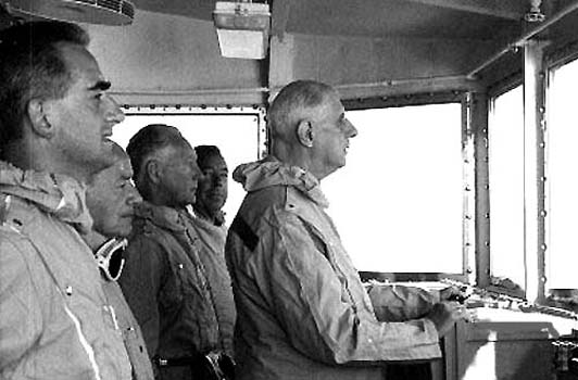 Au tableau de bord, le général de Gaulle président de la République. Derrière, de gauche à droite : Alain Pierrefite (ministre de ?), un inconnu; Pierre Messmer, ancien ministre des armées,